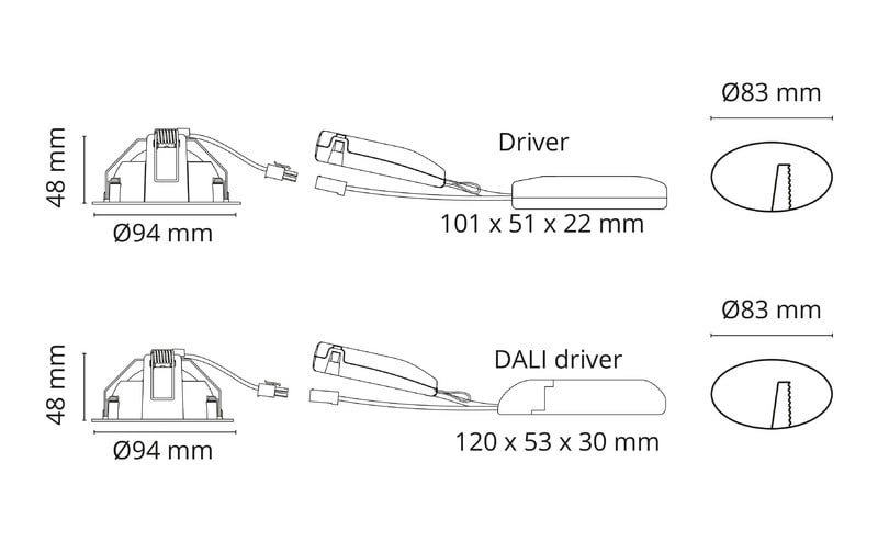 Upotettava LED alasvalo sisäkäyttöön 7W 560lm 4000K. SDMC 1. Ra>98.L90/B10>100 000h. vaihehimmennys (trailing edge). suojausluokka II.IP44. avauskulma 42 astetta. valkoinen (RAL 9003)