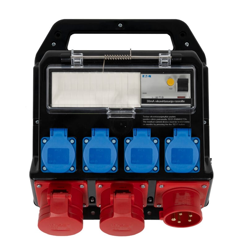 Pienempi kannettava keskus joka soveltuu hyvin pienemmille työmaille. Kaikki pistokkeet suojattu 30mA vikavirtasuojilla.