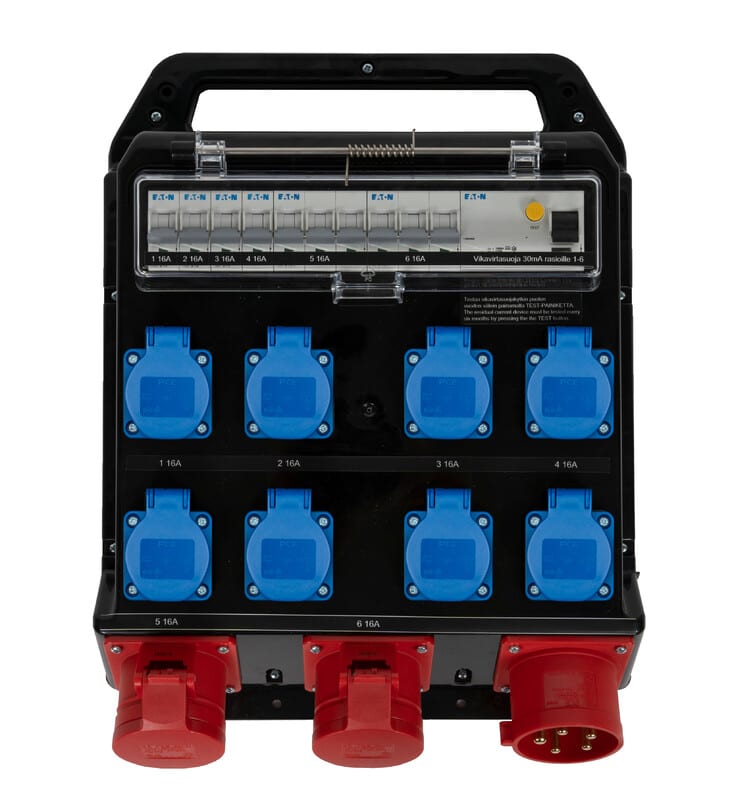 Pieni kannettava keskus usealla 1-vaihepistorasialla pienemmille rakennustyömaille, remontteihin, laajennustöihin jne. Kaikki pistorasiat on suojattu 30 mA:n vikavirtasuojilla.