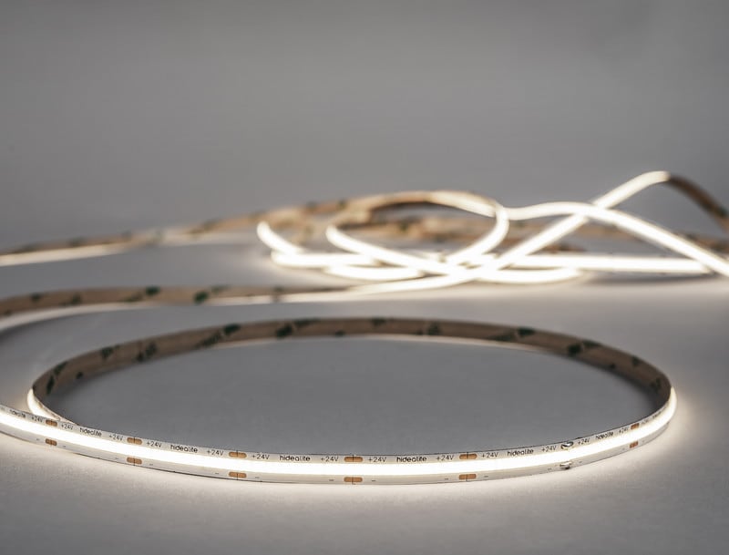 LEDstrip, jonka tekniikka piilottaa LED-sirun ja elektroniikan yhtenäisen fosfori-/silikonikerroksen alle. Lyhyt välimatka diodien välillä mahdollistaa tasaisen valon ilman profiilia tai kupua. COB-tekniikka suurella valomäärällä ja erittäin hyvällä tehokkuudella. 30mm:n katkaisuvälin ja saumattomien liitosten ansiosta on helppo mukauttaa pituuksia. Toimitetaan vakiona 5m:n rullissa itseliimautuvalla teipillä ja 2m:n liitäntäkaapelilla. Ohjain tilataan erikseen sijoituspaikan ja halutun himmennystekniikan mukaan. Enimmäispituus 5m.