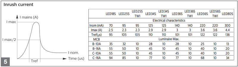 Enimmäismäärä valaisimia, johdonsuojakatkaisija C16: