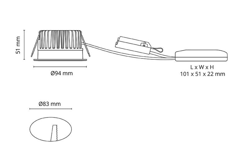 Alasvalo sisä- tai ulkokäyttöön. Erittäin alhainen häikäisyindeksi. Integroitu tehokas LED-valonlähde Ra 98, SDCM: 2 sekä himmennettävä LED-liitäntälaite. Painevalettua jauhemaalattua alumiinia, suojalasi. 42 asteen avauskulma. Upotussyvyys 51mm, upotusaukko Ø83mm. IP54. Tunable White 2000-4000K or 2700-6500K LEDDim