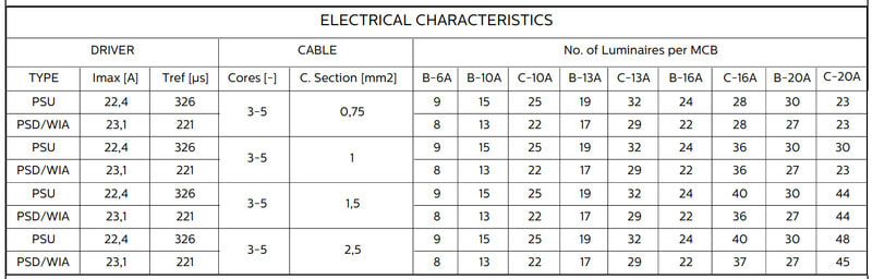 Enimmäismäärä valaisimia, johdonsuojakatkaisija C16: