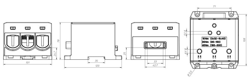 Al/Cu 95 - 300 mm2 ja virtakisko 3x1x32-6x1x40.