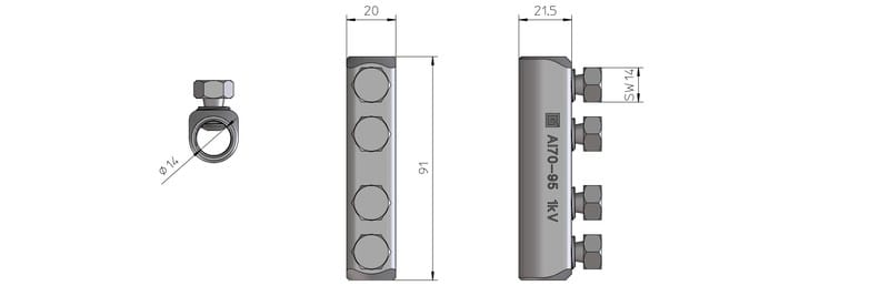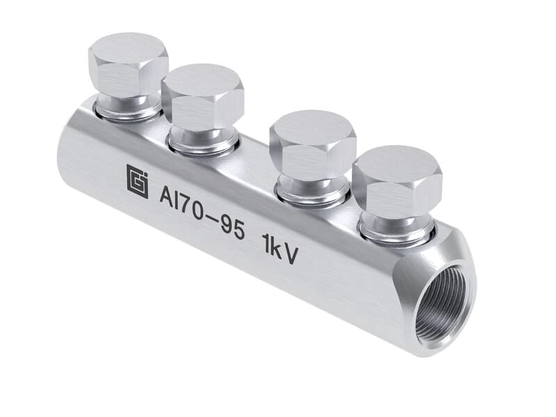 Al-ruuvijatkosholkki 70-95 mm² 4-ruuvinen 1 kV Momenttiruuveilla varustettu ruuvattava alumiininen jatkoliitin soveltuu alumiinikaapeleiden liittämiseen. Kytkentä tehdään momenttiruuvien avulla. Liittimissä on valmiiksi liitosrasvatut kytkentätilat. Jatkoliitin soveltuu sekä pyöreille että sektorin muotoisille kerratuille kaapeleille.