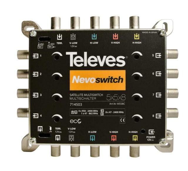 Nevoswitch T714503 on ketjutettava suorajakelukytkin, joka on varustettu 5 tulolla (yksi maanpäällinen ja satelliitin 4 polaarisuutta), 8 lähdöllä ja 12 dB:n potentiometrillä jokaista ulostuloa kohti.Laitetta voidaan käyttää päätelaitteena (tähtiverkossa) tai kaskadina.