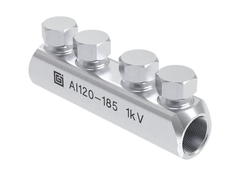Al-ruuvijatkosholkki 120-185 mm² 4-ruuvinen 1 kV Momenttiruuveilla varustettu ruuvattava alumiininen jatkoliitin soveltuu alumiinikaapeleiden liittämiseen. Kytkentä tehdään momenttiruuvien avulla. Liittimissä on valmiiksi liitosrasvatut kytkentätilat. Jatkoliitin soveltuu sekä pyöreille että sektorin muotoisille kerratuille kaapeleille.