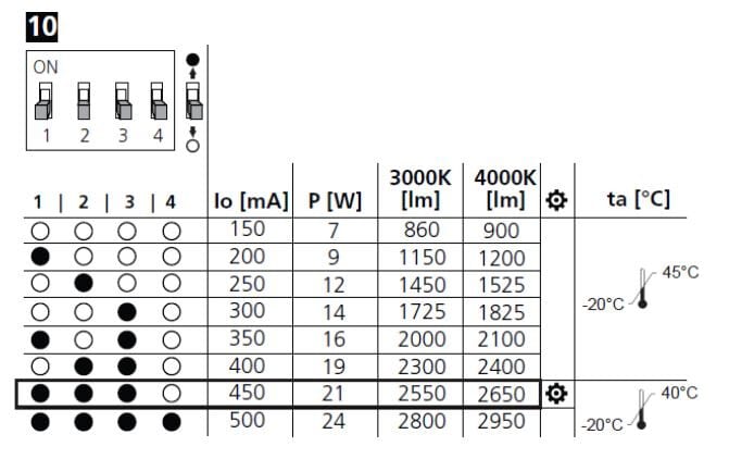 • Valaisimen teho ja valovirta säädettävissä DIP-kytkimellä: 7-24W, 860-2950lm (ei DALI)