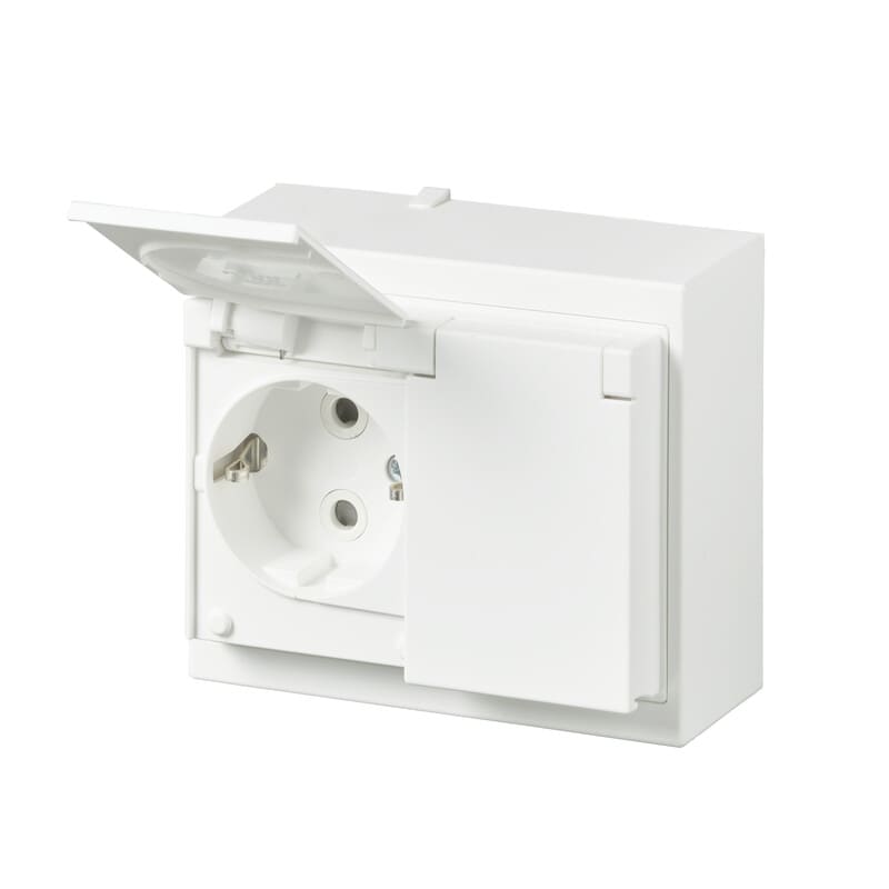 Pinta-asennettava roiskevesitiivis pistorasia. Pistorasiassa on liittimet kutakin kosketinta kohden ja niihin voi kytkeä max 4 johtoa (haaroitusmahdollisuus). Liittimet on hyväksytty ML ja MK johtimille.