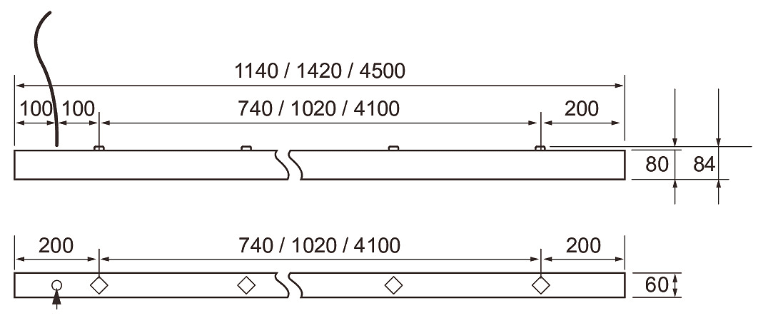 - 1420 mm / 30 W: WH/WH / 4700 lm. WH/BK 4200 lm.