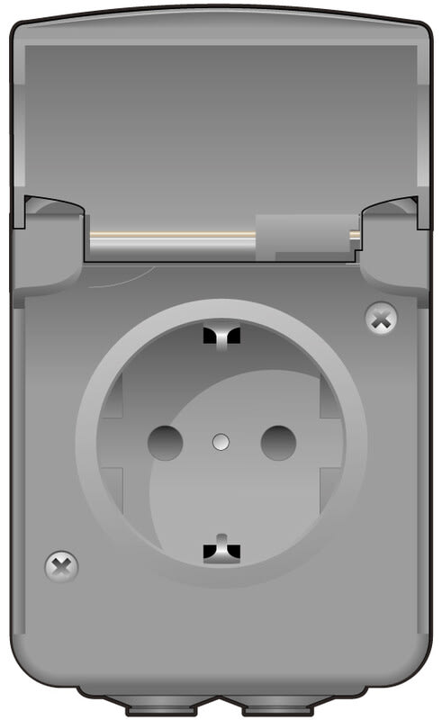 Pinta-asennettava 1-osainen maadoitettu pistorasia turvasuluin. Kotelointiluokka IP44. Pistorasiassa on ruuviliittimet. Liittimet ovat hyväksytty sekä ML että MK johtimille. Pistorasiassa on kalvoläpiviennit kaapeleille ylhäällä ja alhaalla.