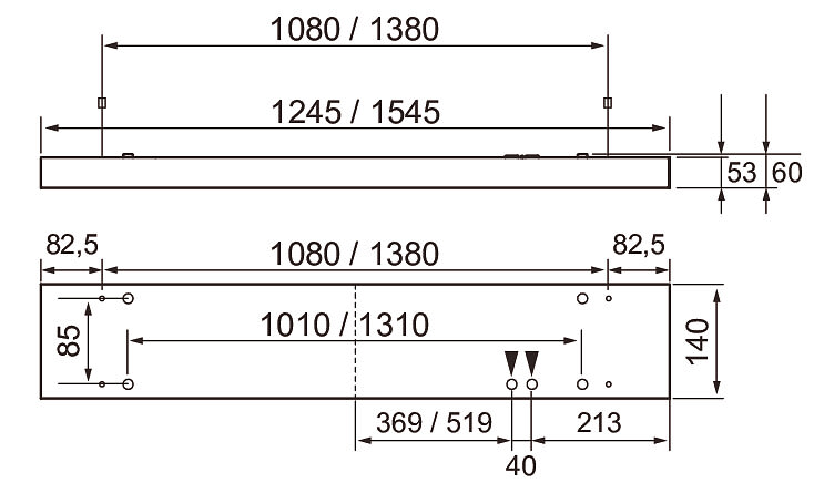 • Hajavalomallit 1545 mm, ylävalo 30 %: 42 W 5000 lm / 58 W 7000 lm.
