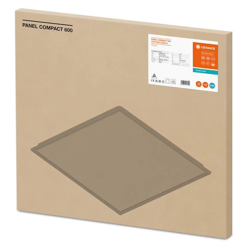 LEDVANCE PANEL COMPACT 600 33W/6500K LED-moduulivalaisin. Valovirta 3630 lm, avauskulma 120D ja valotehokkuus 110 lm/W. IP40- ja IK02-luokiteltu. Mitat: 595 x 595 x 32 mm. Keskimääräinen käyttöikä 70 000 h. PANEL COMPACT -tuoteperheen pitkä 70 000 tunnin käyttöikä ja jopa viiden vuoden takuu tekee siitä houkuttelevan kustannustehokkaan vaihtoehdon valaistuskohteeseesi. UGR19-mallit soveltuvat mikroprismavalopinnan takia erinomaisesti toimistojen yleisvalaisimeksi.