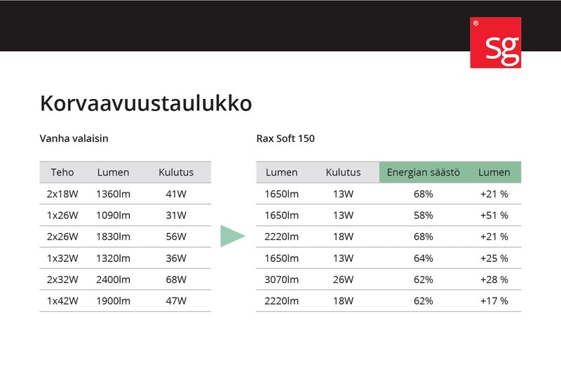 Rax Soft 150 on tehokas downlight-valaisin julkisten rakennusten, toimistojen, käytävien jne. valaistukseen, jossa optimoidun linssi- ja heijastinoptiikan yhdistelmä takaa erinomaisen valonsäädön. Saatavana mattapintaisella heijastimella, joka takaa parhaan mahdollisen tehokkuuden. Rax Soft 150 on helppo asentaa jousilla, jotka sopivat kattopaneeleihin, joiden paksuus on 1-50 mm.