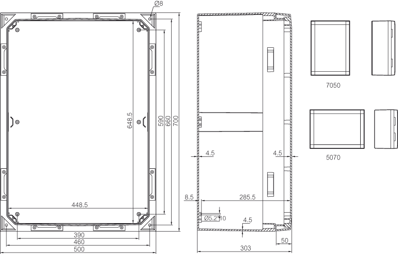 Sisältää : Kaapin alaosa, ovi PUR tiivisteellä, ruuvit asennuslevylle. 3mm kaksoislehtilukko(t) avaimella. S versiot kääntökahvalla. Oviohjain sisältyy. Ei sisällä asennuslevyä. IP66; IK10