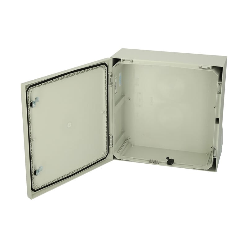 Polykarbonaatti-kaappi, 500x500x210, Harmaa ovi, 2-pistelukitus avaimella, saranat lyhyellä sivulla, ruuvit asennuslevylle, Ei sisällä asennuslevyä, IP66, IK10