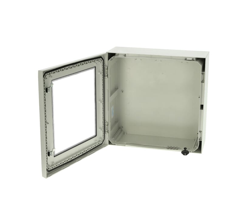 Polykarbonaatti-kaappi, 500x500x210, Harmaa ovi ikkunalla, 2-pistelukitus avaimella, saranat lyhyellä sivulla, Ruuvit asennuslevylle, Ei sisällä asennuslevyä, IP65, IK08
