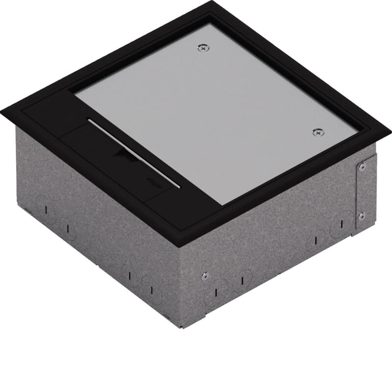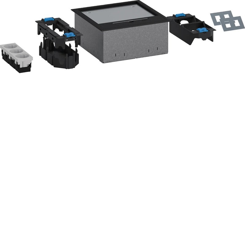 Lattiarasiapakkaus LARA6 kansi Q06 syvennys 5mm pikimusta RAL9005 LARA-lattiarasiapakkaus, nelikulmainen, sisältäen teräslevystä valmistetun valurasian, asennussuojalevyn, asennuskannen, kehysmallisen lattiarasiakannen Q06 5 mm lattiapinnoitesyvennyksellä pikimusta RAL9005, kojerasian 3 kojeelle 45 x 45 mm, kojerasian 2 liitinlevylle tele/AV-liittimille, 3 osaisen pistorasian 33° pesin 16A/250V 45 x 45 mm sekä 2 x liitinlevyä 2 x RJ45 19,3 x 14,8 mm (Keystone). Tuotetta voidaan käyttää erityyppisissä lattiarakenteissa kuivissa sisätiloissa, joissa on kuivapuhdistettavat lattiat. Valurasian sivuseinissä ja pohjassa läpilyöntiaihiot putkiliitäntään (16 x M20; 12 x M25). Voidaan asentaa Q06 mitoitetun valurasian korotussarjan kanssa. Testattu standardien DIN EN 50085-1 ja DIN EN 50085-2-2 mukaisesti.