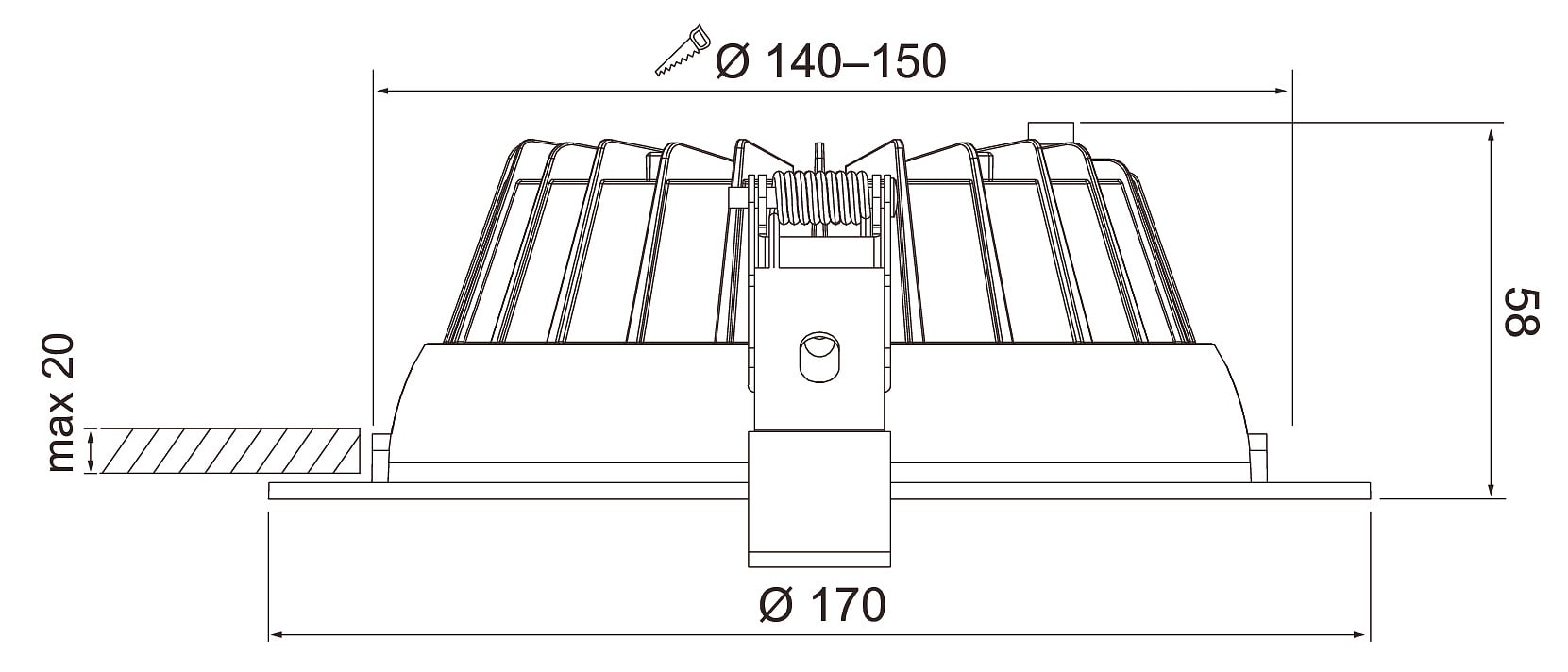 - 150 mm: 8 W 1150 lm, 10 W 1400 lm, 12 W 1700 lm, 14 W 1800 lm.