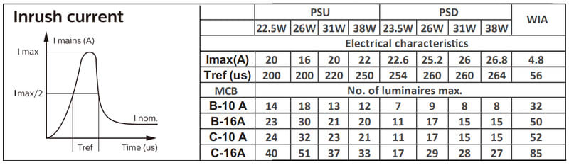 Enimmäismäärä valaisimia, johdonsuojakatkaisija C16: