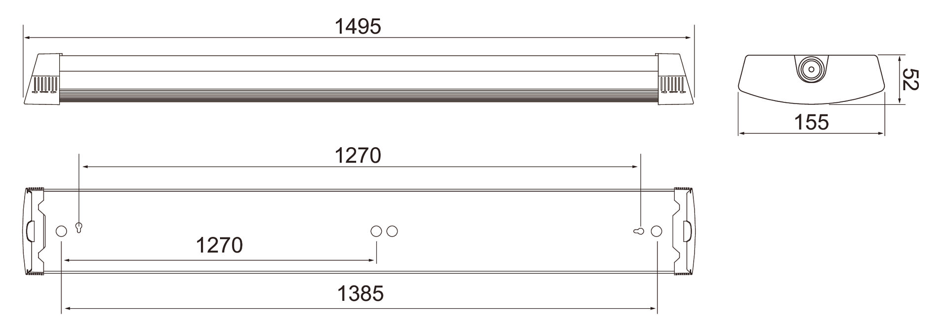 - 1500 mm: 26 W / 3600 lm, 33 W / 4600 lm, 40 W / 5600 lm, 47 W / 6600 lm.