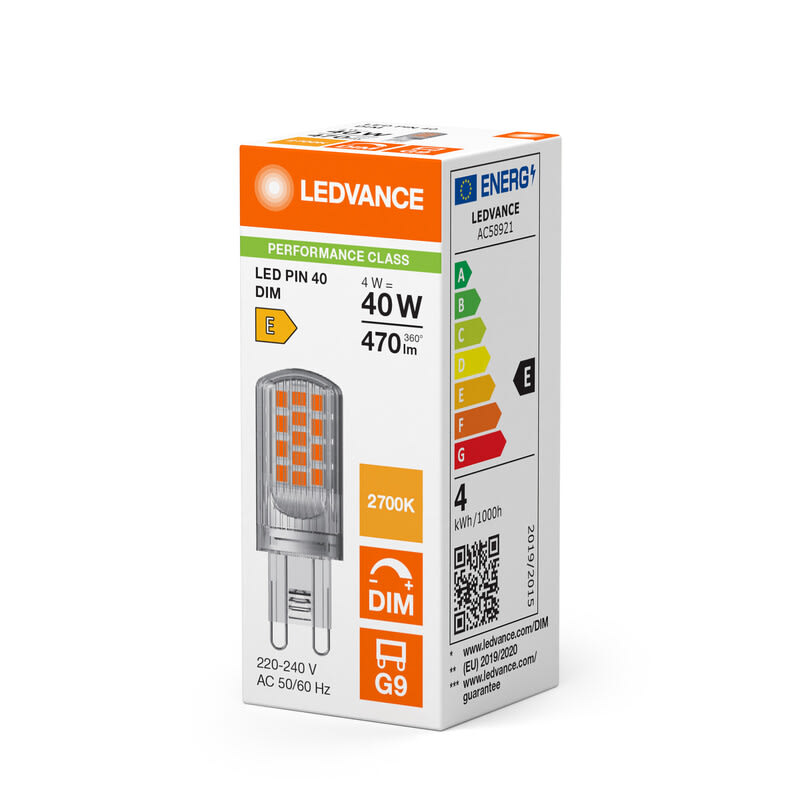LEDVANCE Performance Dimmable PIN 4W 2700K G9 himmennettävä kirkas LED-pienoislamppu. Valovirta 470 lm (vastaa 40 W), avauskulma 300D ja värintoistoindeksi yli 80. Pituus 52 mm, halkaisija 18 mm. Keskimääräinen käyttöikä 25 000 h. LED PIN PERFORMANCE DIMMABLE -tuotepetuoteperheestä löydät pitkäikäisen ja energiatehokkaan LED-pienoislampun yleisimpien Pin-halogeenipolttimoiden tilalle. LED-pienoislamput voivat olla suurempia kuin vanhat halogeenipolttimot, joten kannattaa varmistaa mahtuuko LED-pienoislamppu valaisimeen.