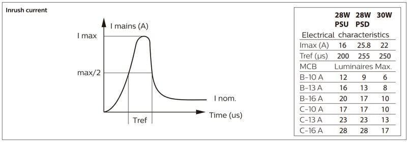 Enimmäismäärä valaisimia, johdonsuojakatkaisija C16: