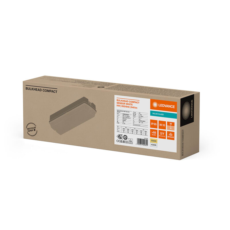 LEDVANCE BULKHEAD RECTANGULAR 8W Multi Select valkoinen pinta-asennusvalaisin liike- ja hämärätunnistimella. Valovirta 500 - 840 lm ja värilämpötila 3000 / 4000 K. IP65- ja IK10-luokiteltu. Mitat: 356 mm x 115 mm x 80 mm. Keskimääräinen käyttöikä 50 000 h BULKHEAD COMPACT RECTANGULAR -tuoteperheen tuotteet ovat varustettu Multi Select -ominaisuudella eli niiden valovirta ja värilämpötila on helposti valittavissa asennuksen yhteydessä. Valaisin on polykarbonaattia ja se soveltuu myös ulkokäyttöön.