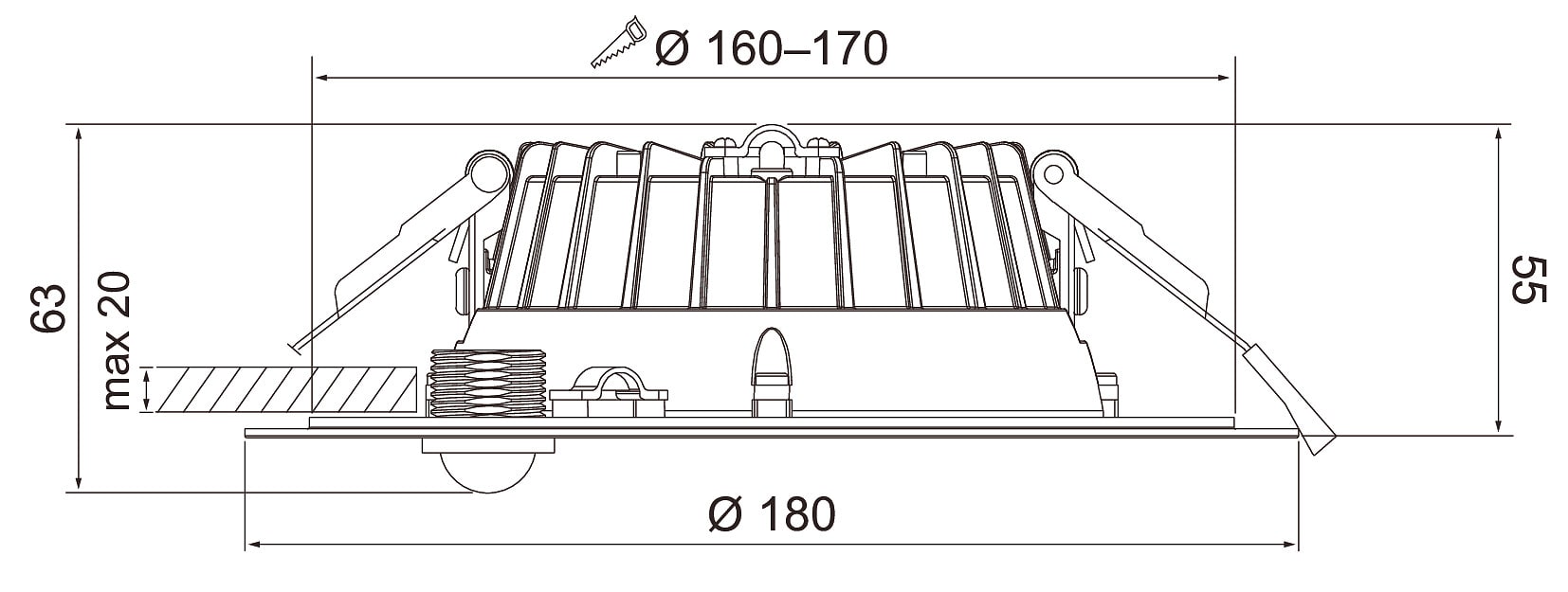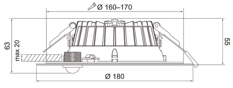- 170 mm: 18 W 2700 lm, 20 W 3000 lm, 22 W 3300 lm, 24 W 3350 lm.