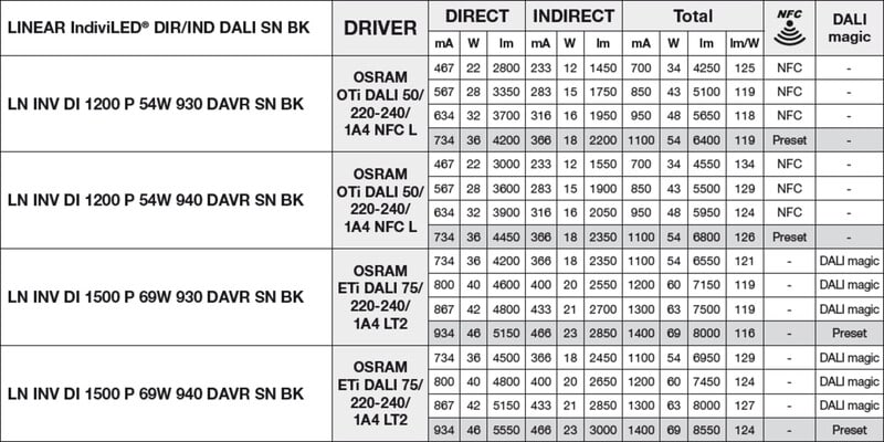 LEDVANCE Linear IndiviLED Direct/Indirect 1500 69W 4000K UGR19 DALI-2 Sensor musta ripustusasennattava toimistovalaisin. Valovirta 8550 lm ja avauskulma 90 D + 130 D. Mitat: 1475 x 125 x 43 mm. Keskimääräinen käyttöikä 100 000 h. LINEAR IndiviLED -tuoteperhe on LEDVANCEn ensimmäinen EVERLOOP-konseptia hyödyntävä valaisintuoteperhe. EVERLOOP-tuotteet ovat suunniteltu kiertotalous mielessä, joka tarkoittaa että niiden virtalähteet ja LED-moduulit ovat helposti vaihdettavissa.