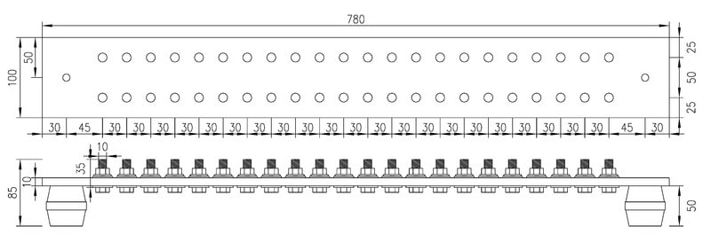 Potentiaalintasauskisko, 10x100x780, 44 reikää M10, kupari Potentiaalitasauskiskoja käytetään kiinteistön sähkönjakelujärjestelmässä sähkölaitteiden ja kiinteistön muiden johtavien osien potentiaalitasausjohtimien yhdistämiseen. Potentiaalintasauskisko yhdistää esimerkiksi maadoitusjohtimet, sähköjärjestelmän metalliosat, metalliputket (vesi-, kaasu- ja lämmitysputket) sekä muut johtavat rakenteet maadoitus- ja potentiaalintasausjärjestelmään. Potentiaalintasauskiskot valmistetaan pinnoittamattomasta kuparista. Kiskoihin on valmiiksi kokoonpantu tarvittavat tukieristimet sekä M10 pultit tarvikkeineen maadoitusjohtimien kaapelikenkiä varten.
