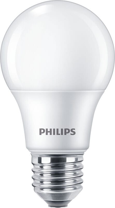 Philips LEDbulb E27-kantainen vakiolamppu soveltuu käytettäväksi yleisvalaistukseen monipuolisissa kohteissa, kuten kodeissa, toimistoissa ja kaupoissa. Kätevä kantokahvallinen pakkaus sisältää 12 lamppua. Lamppujen valovirta on 806 lm ja teho 8 W. Valotehokkuudeltaan lamput ovat 100 lm/W ja ne korvaavat 60 W perinteisen lampun. Lamppujen värilämpötila on 3000 K. Niiden käyttöikä on 15 000 tuntia kahden vuoden takuulla.