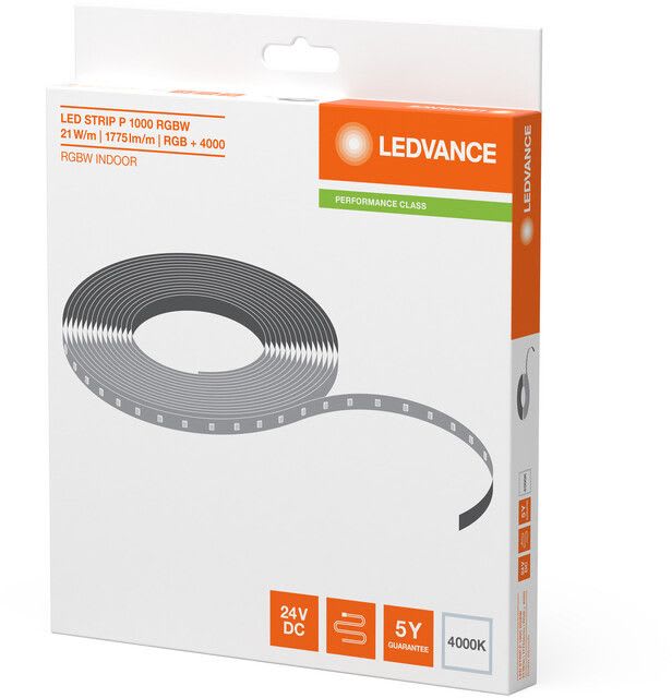 LEDVANCE LED STRIP PERFORMANCE RGBW 4000K CRI90 5m 24V LED-valonauha. Kokonaisvalovirta 8450 lm (1775 lm/m) ja -teho 106 W (21 W/m). Nauhassa RGB- ja 4000 K LEDit. Mitat: 5000 x 12 x 2,1 mm. Keskimääräinen käyttöikä 50 000 h.