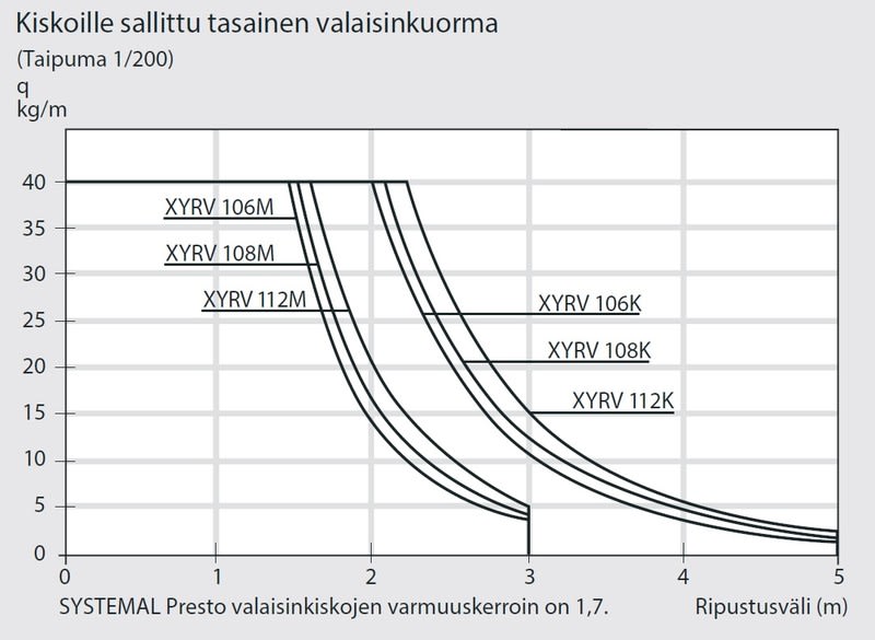 Alumiinisia SYSTEMAL Presto valaisinkiskoja valmistetaan kuormitettavuudeltaan kahta erilaista tyyppiä, M (korkeus 44 mm) ja K (korkeus 60 mm). Kumpaakin kiskoa on saatavissa kolmea eri leveyttä: 66, 80 ja 120 mm. Vakio toimituspituus on 6 metriä.