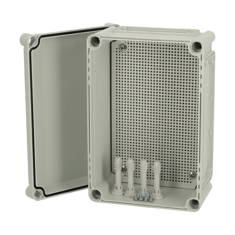 Polykarbonaattikotelo, 280x190x130, 1kpl muovinen MPI-asennuslevy, Laippa-aukollinen alaosa (2kpl koko1, 2kpl koko2), Harmaa kansi PUR-tiivisteellä, 4kpl harmaa polyamidi kansiruuvi, 4kpl PT60x11 PH3 asennusruuvi, 4kpl ruuvi asennuslevylle, IP66/67, IK08 FIBOX EK polykarbonaattikotelot