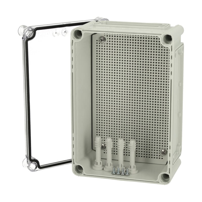 Polykarbonaattikotelo, 280x190x130, 1kpl muovinen MPI-as.levy, Laippa-aukollinen alaosa (2kpl koko1, 2kpl koko2), Läpinäkyvä kirkas kansi PUR-tiiv., 4kpl harmaa polyamidi kansiruuvi, 4kpl PT60x11 PH3 asennusruuvi, 4kpl ruuvi asennuslevylle, IP66/67, IK08 FIBOX EK polykarbonaattikotelot