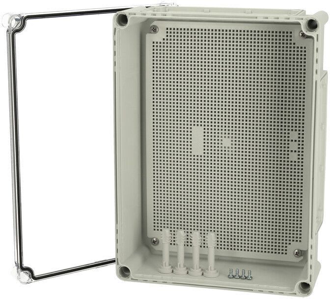 Polykarbonaattikotelo, 380x280x130, 1kpl muovinen MPI-asennuslevy, Laippa-aukollinen alaosa (4kpl koko2), Läpinäkyvä kirkas kansi PUR-tiivisteellä, 4kpl harmaa polyamidi kansiruuvi, 4kpl PT60x11 PH3 asennusruuvi, 4kpl ruuvi asennuslevylle, IP66/67, IK08 FIBOX EK polykarbonaattikotelot