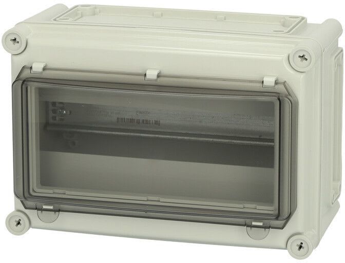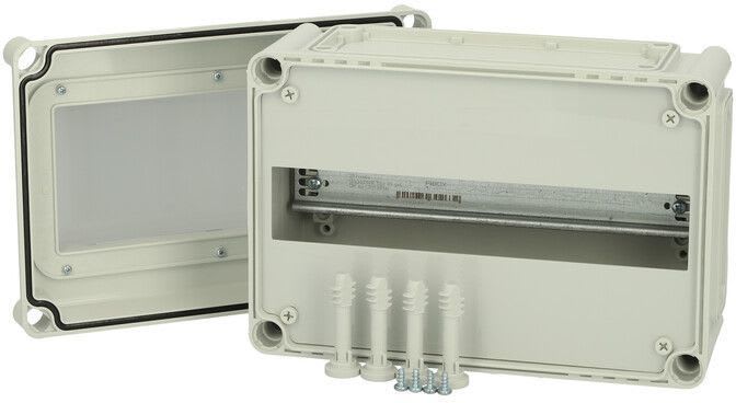Sisältää : Laippa-aukollinen alaosa, ruuvit asennuslevylle, kansi PUR-tiivisteellä ja polyamidi kansiruuveilla. Sisältää DIN-kiskojärjestelmän. Tarkistusluukulla. IP65; IK08