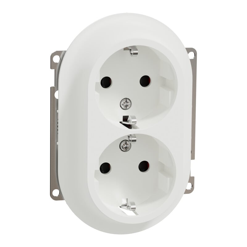 ELKO One 2-PR keskiölevyllä JL valkoinen ELKO One keskiölevyllinen 2- pistorasia jousiliittimillä on kehitetty yhdessä sähköasentajien kanssa. Uudistetut jousiliittimet nopeuttavat asennusta ja uudet ergonomiset vapautuspainikkeet helpottavat johtojen irrottamista. Uppoasennuksessa kojerasiaan voidaan tarvittaessa lisätä kiinnitys kiinnityspakkauksella. Sen nimellisjännite on 250 V AC taajuudella 50/60 Hz, ja sen nimellisvirta on 16 A. Tuotteen mitat ovat (W) 71 mm x (K) 106 mm x (S) 42 mm. Se on valmistettu kierrätetystä polykarbonaatista (PC). Tuotteen väri on kirkkaan valkoinen (RAL 9003) ja se on mattapintainen. Se saavuttaa IP21-suojaustason IK08-iskulujuudella.