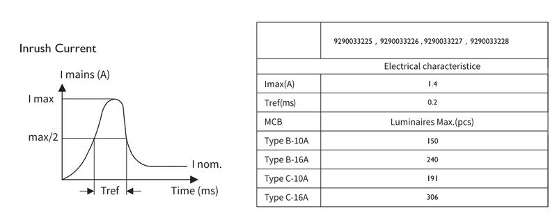 Enimmäismäärä valaisimia, johdonsuojakatkaisija C16:
