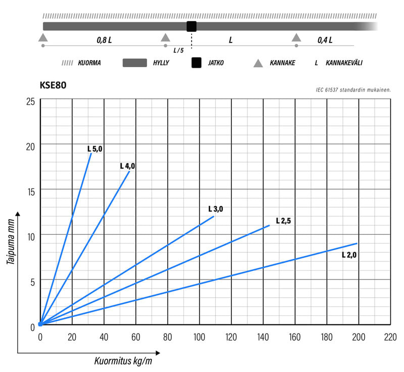 IEC 61537:n mukainen turvallinen työkuorma, kun tukiväli on 5,0 m.:
