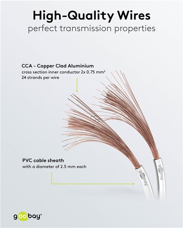 Hifi-järjestelmien, kotiteatterijärjestelmien, kaiuttimien, vastaanottimien, vahvistimien ja tehovahvistimien helppoon johdotukseen Yhdistettynä nykyaikaisiin hifi-äänijärjestelmiin kaiutinkaapeli luo vertaansa vailla olevan musiikkikokemuksen korkeimmalla äänenlaadulla. Kaiutinkaapeli korkealaatuisella säikeisellä johdolla (CCA: Copper Clad Aluminium) takaa hyvät siirto-ominaisuudet mm. hifijärjestelmän ja kaiuttimen välillä Napaisuusmerkintä oikeaan liitäntään ja kaiutinlinjan helppoon reititykseen Joustavan ja kestävän PVC-kaapelivaipan ansiosta Hi-Fi-kaapeli on helppo taivuttaa ja asentaa. Täyttää rakennustuoteasetuksen (CPR) ja ECA:n palosuojausluokan Metreitse toimitettu Goobay Hi-Fi -kaiutinkaapeli voidaan koota kulloiseenkin käyttöön.