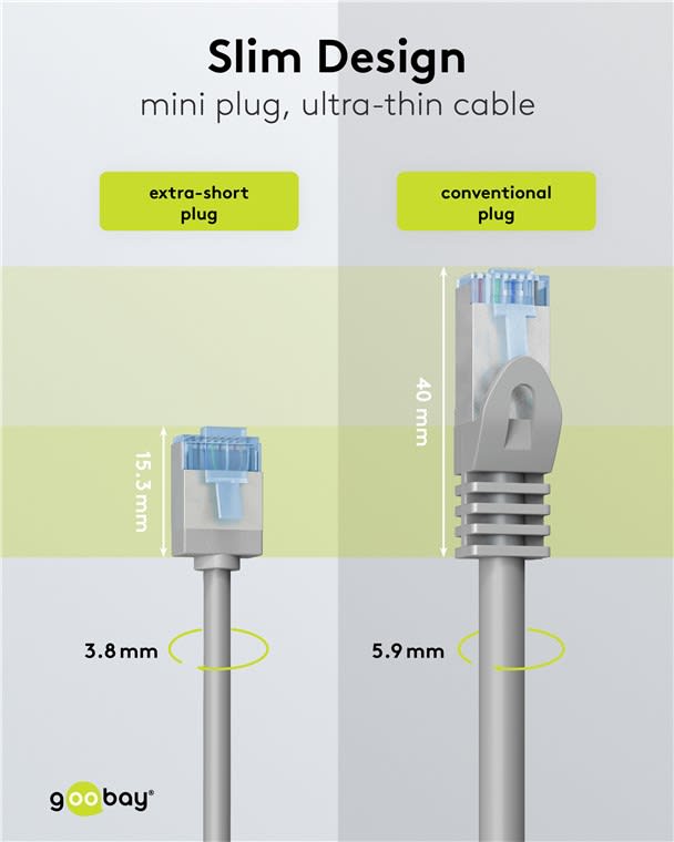 Erittäin ohut LAN-kaapeli erittäin lyhyillä RJ45-liittimillä vähentää kaapelin tilavuutta palvelinkaapissa tai patch-paneelissa ja optimoi siten ilmavirran Turvallisesti joustava: Ilman kierrettyä parisuojaa ja vähäsavuinen, halogeeniton TPE-vaippa takaa erityisen pienen taivutussädön ja suuren joustavuuden AWG 32:n ja 3,8 mm:n ulkohalkaisijan ansiosta kaapeli on erittäin ohut, mutta yhtä tehokas kuin tavallinen CAT-kaapeli CAT-6A-verkkokaapelina se sopii erinomaisesti nopeisiin yhteyksiin, kuten 10 Gigabit Ethernet 10GBASE-T, 100BASE-TX, 1000BASE-T ja 10/100/1000/10000 Mbps RJ45-kaapeli soveltuu Power over Ethernetille (PoE, PoE+) ja on CAT-6A-testattu (toimitetaan yksilöllisen mittausprotokollan mukana) Laadukkaat kuparijohtimet (CU) ja kullatut liitinkoskettimet takaavat alhaiset siirtovastukset ja estävät korroosiota Tehokas, kompakti taittumissuoja on vahva kaapelin rikkoutumista vastaan ja varmistaa Ethernet-kaapelin pitkän käyttöiän