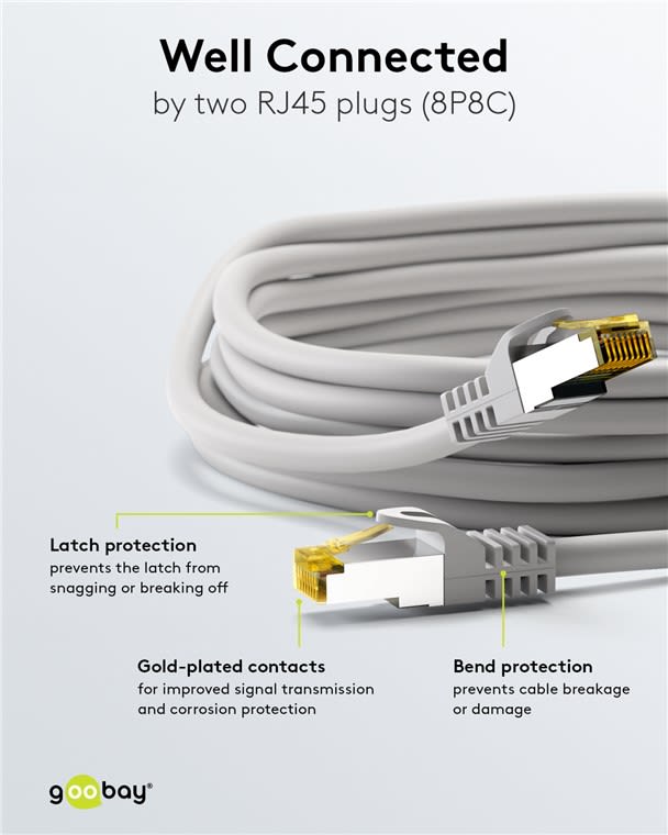 Koottu, kaksoissuojattu LAN-kaapeli (CAT 7 ja 600 MHz) RJ45-liittimillä (CAT 6A 500 MHz) verkkokomponenttien liittämistä varten Nopea Internet-kaapeli erityisesti pelikonsoleille, joissa on korkearesoluutioinen kuvanäyttö (8K @ 60 Hz ja 4K @ 120 Hz), kuten Sony PlayStation 5 tai Microsoft Xbox X S/FTP-kokonaissuojaus: alumiinifoliosuojaus yksijohdinpareille (PiMF) ja alumiinipunottu suojaus kaapelivaippaan Laadukas kuparijohdin (CU) ja 50 μ kullatut kosketuspinnat takaavat erinomaisen ja tehokkaan verkkoyhteyden. RJ45-liittimen napsautettava nenäsuoja estää napsautuskorvaketta takertumasta tai katkeamasta luotettavan Internet-yhteyden varmistamiseksi. Tinkkisuojaläpivienti ja tukeva vaippa tarjoavat Ethernet-kaapelille optimaalisen suojan kaapelin katkeamista vastaan. CAT-7-kaapeli soveltuu Power over Ethernetille (PoE, PoE+) ja 10 Gigabit Ethernetille jopa 10/100/1000/10000 Mbps:n nopeuksilla.