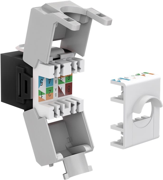 RJ45‑naarasliitin (8P8C), UTP‑suojaamaton. CAT 6A ‑luokan keystone‑liitin pysyvien verkkokaapelointien päättämiseen. Toolless‑IDC‑liitäntä ja crocodile‑tyyppinen rakenne mahdollistavat nopean, työkaluttoman asennuksen. Muovirunko soveltuu perus‑ ja ammattitason verkkoasennuksiin. Liitin sopii CAT 6A ‑kaapeleille, joiden ulkohalkaisija on 5,0–9,0 mm, ja tukee PoE+‑syöttöä (IEEE 802.3at). TIA 568A/B ‑värikoodaus helpottaa johdotusta patch‑paneeleissa, pinta‑ ja upporasioissa. Johdinalue: solid AWG 22–26 (Ø 0,48–0,65 mm).