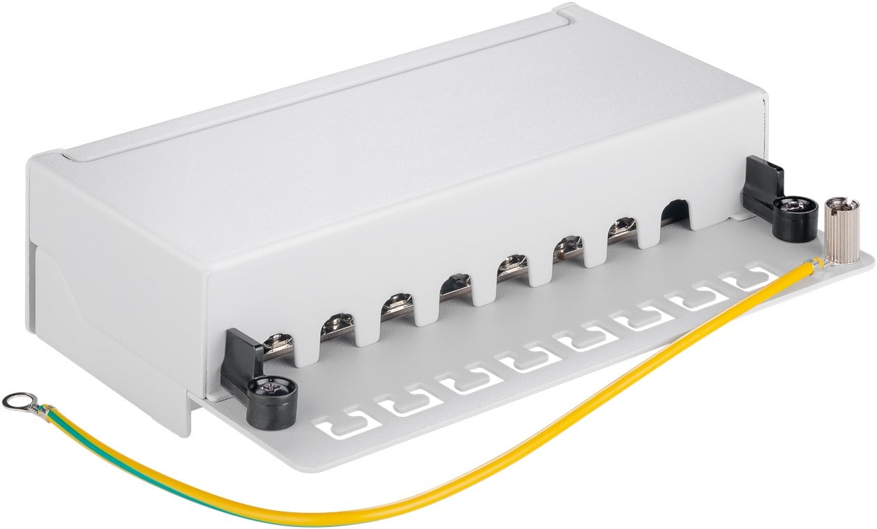 CAT 6A mini‑patch‑paneeli, 8 porttia, STP, pöytä‑ ja seinäasennukseen. Kompakti 8‑porttinen CAT 6A ‑luokan mini‑patch‑paneeli valmiiksi päätettyjen RJ45‑verkkojohtojen liittämiseen. Suojatut RJ45‑portit on sijoitettu korkealaatuiseen metallikoteloon, jossa on “Easy Open” ‑toiminto (avaus ilman työkaluja). IDC‑liittimet mahdollistavat juotos‑, ruuvi‑ ja kuorintavapaan asennuksen (IDC‑työkalu vaaditaan). Paneeli voidaan kiinnittää seinälle tai pöytätasolle mukana toimitetuilla kiinnitysruuveilla. TIA‑568 A/B ‑värikoodaus sekä numeroidut portit takaavat siistin ja virheettömän kaapelinhallinnan.