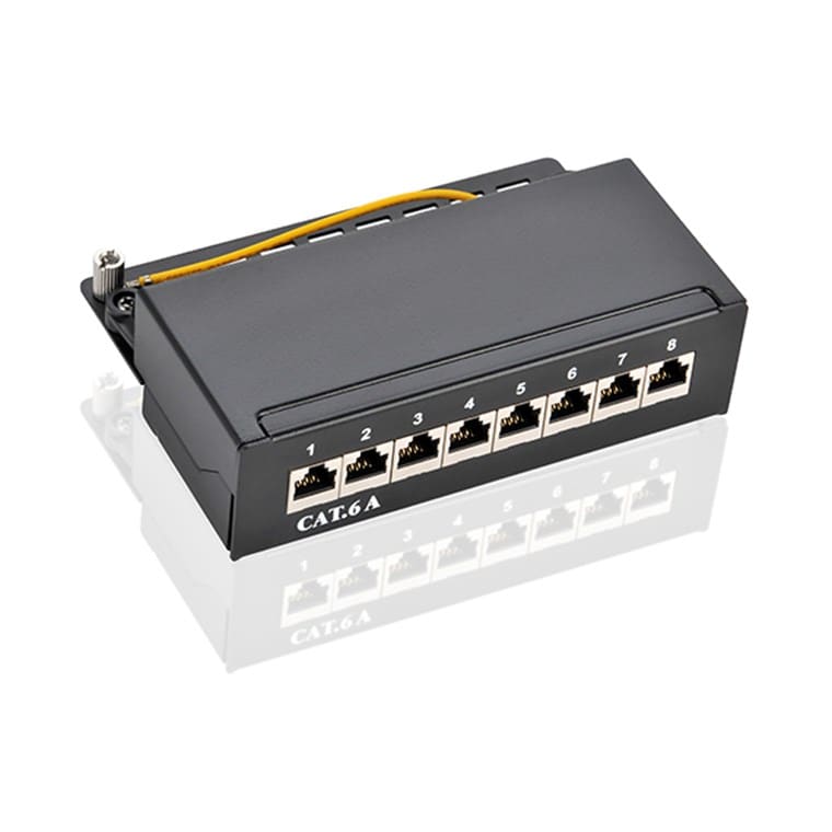 CAT 6A mini‑patch‑paneeli, 8 porttia, STP, pöytä‑ ja seinäasennukseen. Kompakti 8‑porttinen CAT 6A ‑luokan mini‑patch‑paneeli valmiiksi päätettyjen RJ45‑verkkojohtojen liittämiseen. Suojatut RJ45‑portit on sijoitettu korkealaatuiseen metallikoteloon, jossa on “Easy Open” ‑toiminto (avaus ilman työkaluja). IDC‑liittimet mahdollistavat juotos‑, ruuvi‑ ja kuorintavapaan asennuksen (IDC‑työkalu vaaditaan). Paneeli voidaan kiinnittää seinälle tai pöytätasolle mukana toimitetuilla kiinnitysruuveilla. TIA‑568 A/B ‑värikoodaus sekä numeroidut portit takaavat siistin ja virheettömän kaapelinhallinnan.