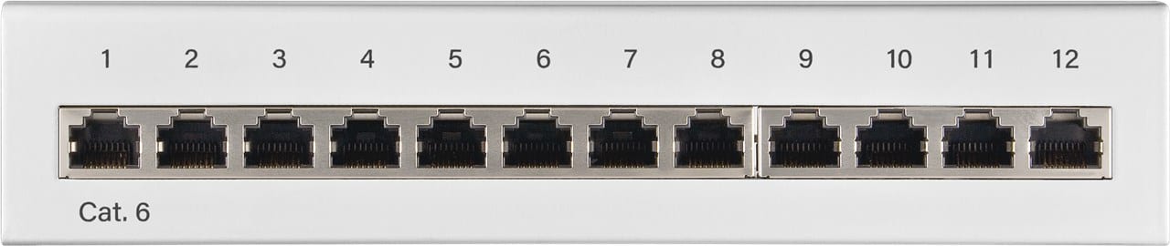 CAT 6 mini-/pöytäpatch‑paneeli, 12 porttia, STP‑suojattu. 12‑porttinen CAT 6 ‑luokan mini‑patch‑paneeli valmiiksi päätettyjen RJ45‑kaapeleiden liittämiseen. STP‑suojatut portit on sijoitettu korkealaatuiseen metallikoteloon, jossa on “Easy Open” ‑toiminto (avaus ilman ruuveja ja työkaluja). IDC‑liittimet mahdollistavat juotos‑, ruuvi‑ ja kuorintavapaan kaapelipäätöksen (IDC‑työkalu tarvitaan). Paneeli voidaan asentaa seinälle tai pöytätasolle mukana toimitettujen kiinnitysruuvien avulla. TIA‑568 A/B ‑värikoodaus sekä numeroidut portit takaavat siistin ja virheettömän kaapelinhallinnan.