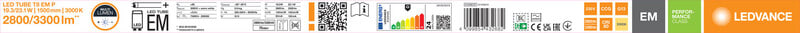 LEDVANCE LED TUBE T8 EM Performance 1500mm 3000K Multi Lumen G13 LED-valoputki 58W:n T8-loistelampun tilalle. Valovirta 3300/2800 lm ja valotehokkuus 145 lm/W. Pituus 1513 ja halkaisija 26,7mm. Keskimääräinen käyttöikä 75 000 h. Käyttö: kuristin tai 230V. LED TUBE T8 EM PERFORMANCE -tuoteperheestä löydät pitkäikäiset 75 000 tunnin käyttöiällä varustetut sirpalesuojatut LED-valoputket. Valoputken päästä löytyvästä Multi Lumen -liukukytkimestä voit valita pienemmän valovirran, jonka avulla voit säästää hieman enemmän energiaa. LED-valoputkien mukana toimitetaan oikosulkupala, jonka ansiosta LED-valoputken asentaminen loistelampun tilalle on helppoa.