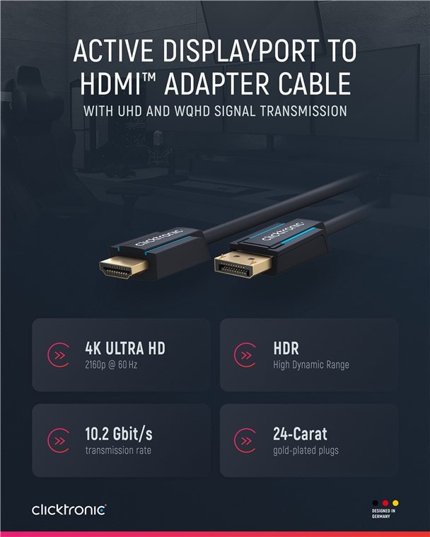 Premium-kaapeli. 1x DisplayPort-liitin™ >> 1x HDMI-liitin™. 2,0 m. 4K @ 60 Hz DisplayPort-HDMI-kaapeli™™ yhdistää ulkoiset näytöt ja projektorit PC:hen, kannettavaan tietokoneeseen tai Maciin. UHD-signaalin siirto 4K @ 60 Hz (2160p) ja WUXGA @ 60 Hz (1200p) takaavat kristallinkirkkaan äänen ja veitsenterävän video- ja kuvanlaadun Näyttökaapeli, jonka suurin siirtonopeus on jopa 10,2 Gbit/s ja HDR optimaalisen viihdekokemuksen takaamiseksi Integroitu signaalivahvistin estää signaalin häviämisen, joten Clicktronic-kaapeli soveltuu erityisen hyvin pidempien etäisyyksien ylittämiseen. 24 karaatin kullatut DisplayPort-liittimet™ minimaaliseen siirtovastukseen ja sujuvaan kuvansiirtoon ilman viiveitä Mekaanisella liittimen lukituksella varustettu DisplayPort-liitin™ estää koskettimien löystymisen. Signaalin suunta: Integroidun signaalin vuoksi ampnostin, DisplayPort-kaapeli™ on kytkettävä siten, että painetut kolmiot osoittavat lähettimestä (esim. PC) vastaanottimeen (esim. näyttöön).